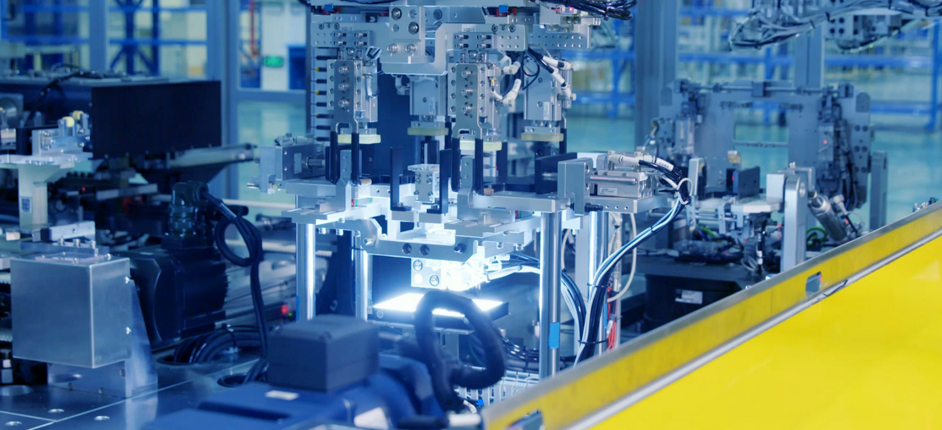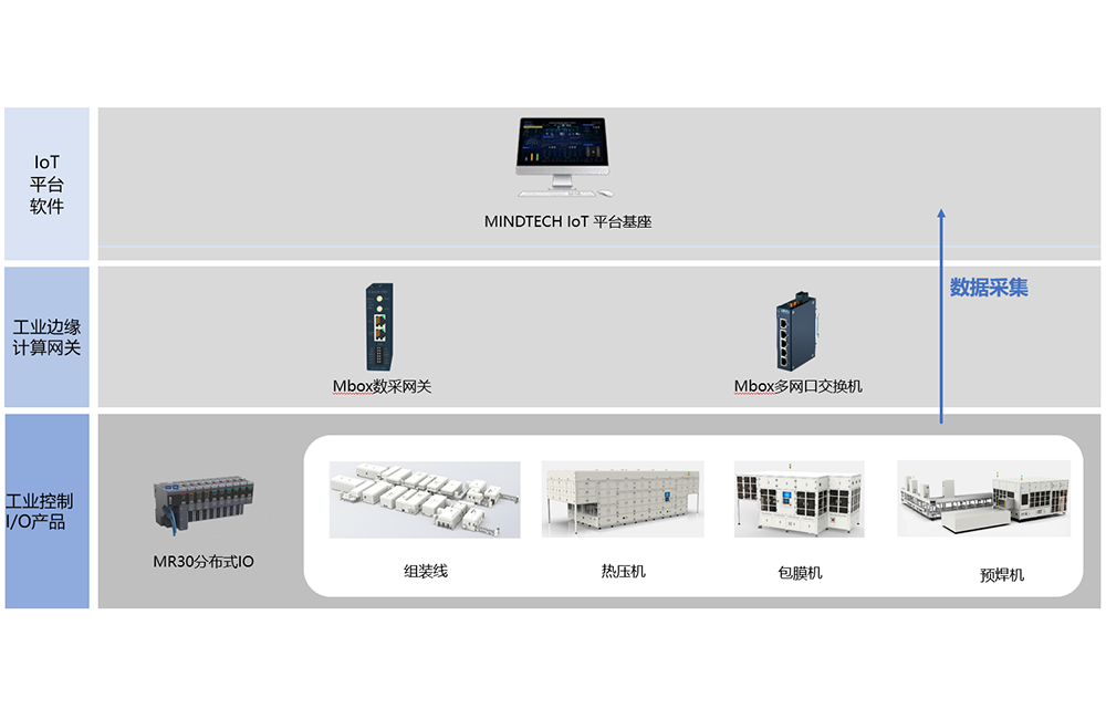The square shell battery cell assembly line is a key equipment used for producing automotive power batteries and energy storage lithium batteries. It mainly includes hot press machines, pole ear pre welding matching machines, pole ear ultrasonic welding machines, adapter laser welding machines, Mylar coating machines, etc., to ensure the accuracy and efficiency of battery cell assembly. The equipment on the assembly line adopts Omron NJ501 series PLC, whose IO can be replaced with Mingda's MR30 distributed IO module with EtheCAT protocol. At the same time, it is matched with Mingda IOT platform base to achieve one-stop connection, which can efficiently create a digital workshop and realize factory intelligence.